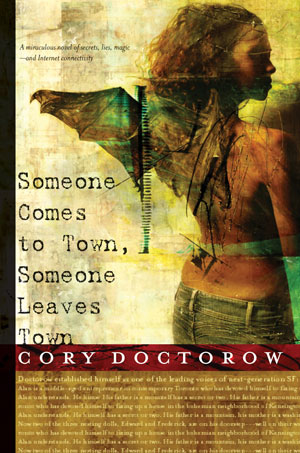 I know, I know—the RWA has suspended the graphics standards, they have an ad hoc committee studying the issue, yadda yadda yadda. But I came across this image for Cory Doctorow’s Someone Comes to Town, Someone Leaves Town and was struck by two things: