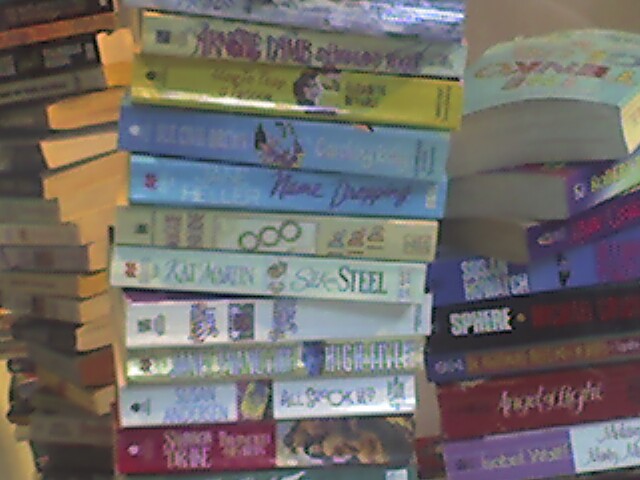 Here’s a close up of the tall stack that’s front and center in the window. If you’re Susan Anderson, Jane Heller, the late Arnette Lamb, Kat Martin, or Maggie Shane, you’re getting some damn fine publicity.