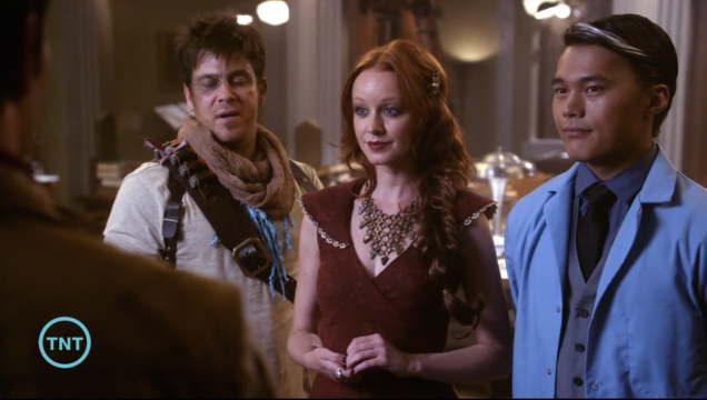 The pyramids create a doorway to the void – the space where the library is. On the way to figuring this out, Cassie has a nosebleed and clearly her tumor is getting the best of her. Flynn thinks that because he has the sarcophagus, he can get to the void, but Jenkins points out that the sarcophagus only works when it’s powered by the pyramids, which are built with great precision on ley lines. Flynn says they need lots of things and he talks very quickly and I like him better when I’m not trying to keep up for recapping purposes. He needs stuff, OK? Jake reminds us all that they still have the reality altering storybook from a few episodes ago, to power the magic. Morgan LeFay can be the software. Eve is smug. I am confused. They have a dimensional stabilizer courtesy of Tesla, and a ball of twine from the minotaur. “The clipping book sent you to get all these things? Almost as if it was fate,” says Fynn. Hmmmm. Jenkins says they don’t need the twine so of course you’ll never see the twine again. *sarcasm*
