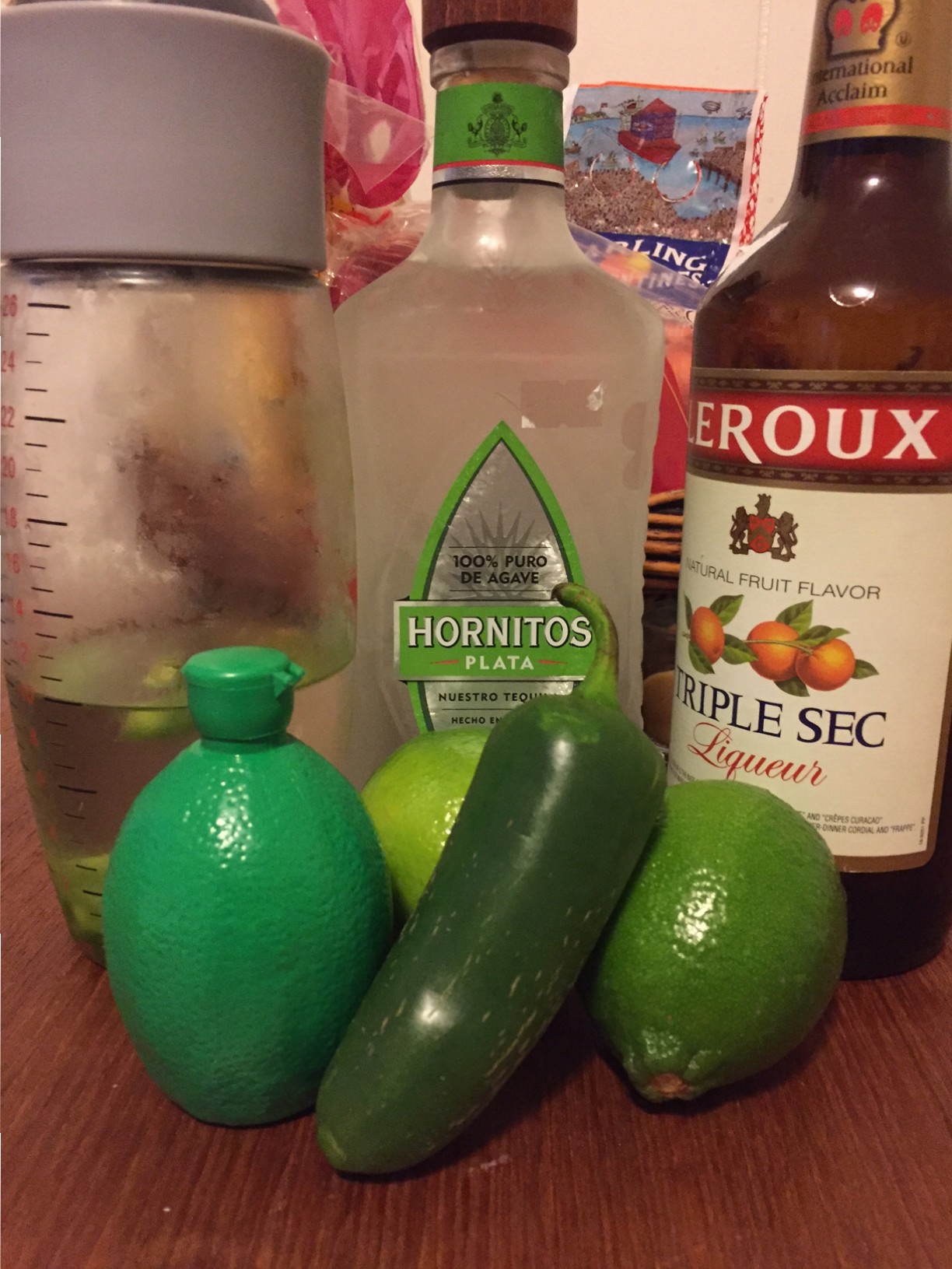 To make this, I took about ten ounces of the tequila I had and chopped half of a jalapeño. I had some huge jalapeños. If they were smaller, I would have put in the whole thing. After removing the seeds and dicing the pepper, I put them into my shaker and muddled them a bit to break them down. I also don’t own a muddler, so being the resourceful woman I am, I used a wooden spoon. I poured in the tequila and popped it into the fridge where it sat for about three days before I used it. Whatever I didn’t use, I sealed up in a mason jar for future margaritas.