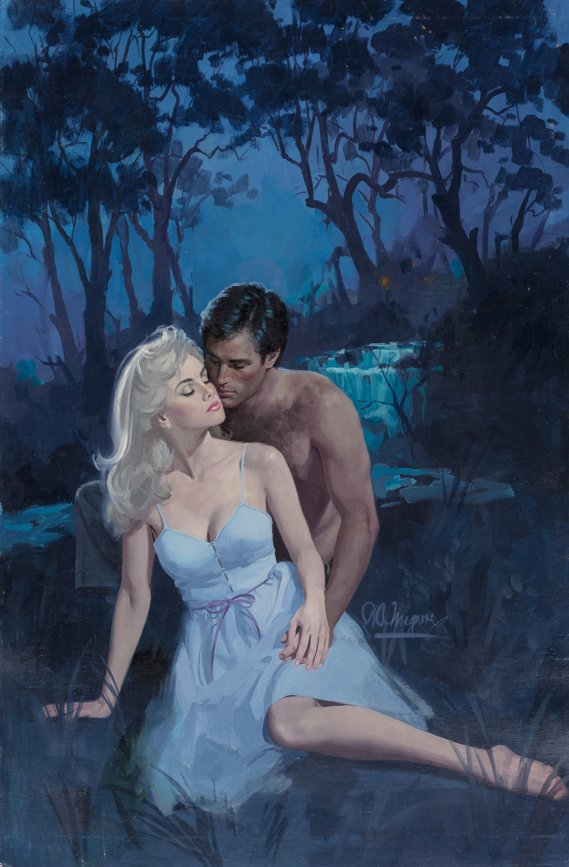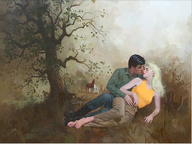 Normally on HaBO Tuesdays, we’re trying to hunt down books based on specific plots, but this week is a little different. Instead, Lynn is trying to find romances with covers that her father painted. Lynn’s father is Robert A Maguire, “a renowned paperback illustrator and subject of the book Dame, Dolls and Gun Molls.” Maybe we can help her: