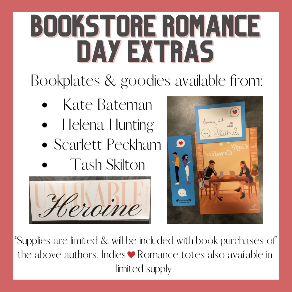 The following authors have supplied signed bookplates for titles you purchase through the store: Kate Bateman, Helena Hunting, Scarlett Peckham, and Tash Skilton. More may come in! We also have some fun extra items like stickers, bookmarks, and postcards to be included. Tote bags are being supplied by Avon and Bookstore Romance Day, though we’re unsure of the bag count just yet.