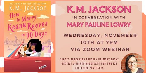 TONIGHT! I hope you’ll join me as I introduce authors K.M Jackson and Mary Pauline Lowry as they talk about Jackson’s latest contemporary romance. Preorders get a couple cute postcards and a signed bookplate! The event is free to attend.