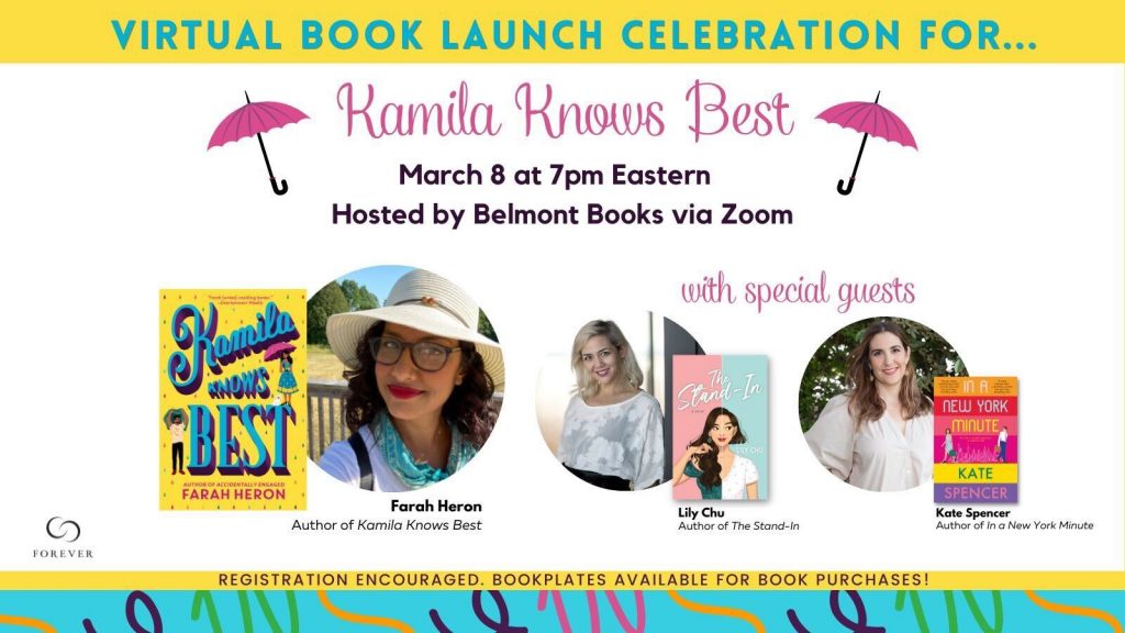 Tuesday, March 8th at 7pm ET: I’m so sad to miss this launch! Farah Heron will be celebrate her release of Kamila Knows Best with fellow romance authors Lily Chu and Kate Spencer. Attendance is free and I believe Belmont Books is getting signed bookplates for Farah and Kate’s books. Please consider ordering through them! Register here!