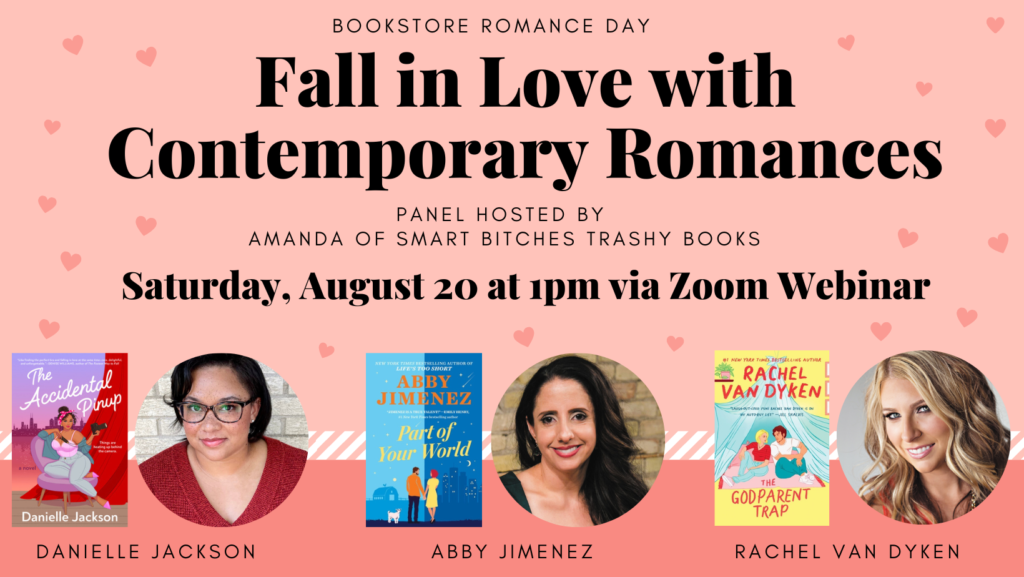 Saturday, August 20th is Bookstore Romance Day! I’m running a virtual panel that afternoon, if any of you are available and want to attend. (Register here!) I’d love to have ya! You can also check to see if your local independent bookstore is doing something in celebration.
