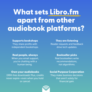 Sarah: Libro.fm audiobook subscription service is now available globally! As of today, July 26, bookshops around the world can earn income through audiobook sales.