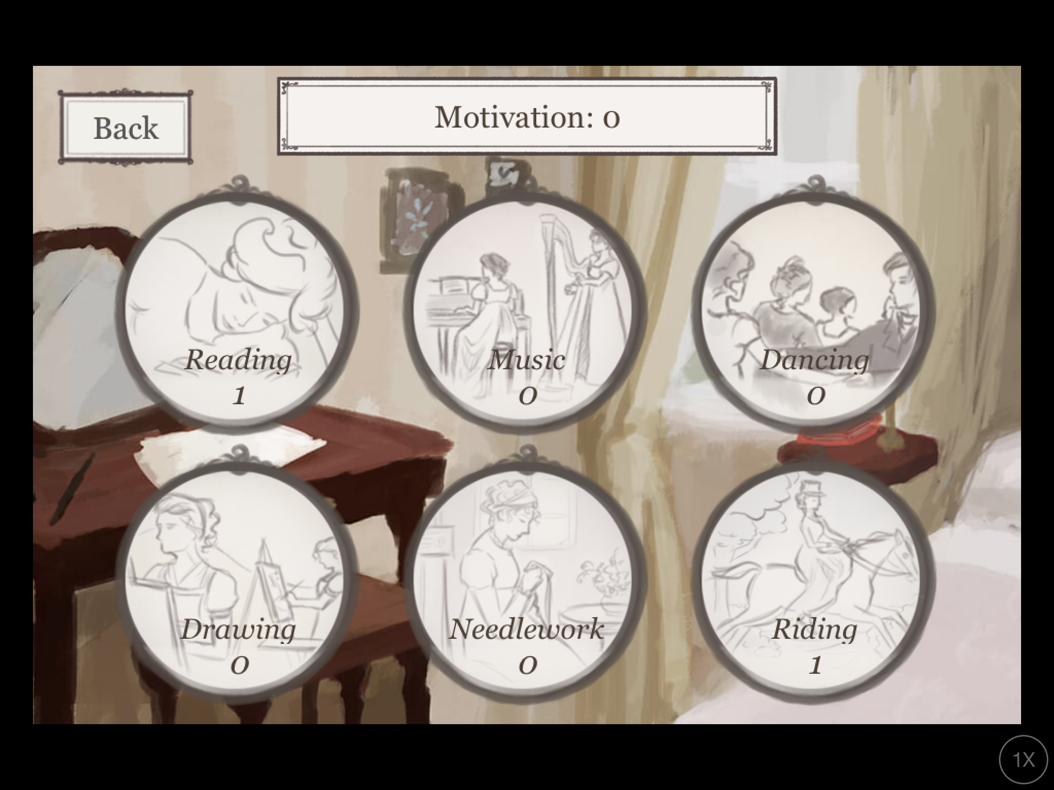 Your character has six different skill areas – reading, music, dancing, drawing, needlework, and riding. As you go through interactions, you get the opportunity to earn “motivation points,” which you can then put into the skill areas. The game also offers other ways to earn these points – hangman-type mini-games will appear to solve the word in a particular quote or multiple choice questions will pop up to answer. These questions vary from Jane Austen knowledge to what you know about the Regency time period.