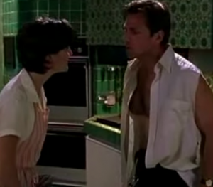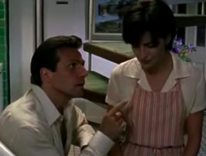 They get back to her place (does he not have a place of his own?) and finally get around to making luuuuuuuuurve. (That’s at minute fifty-six for those keeping track). There’s some odd piano-and-flute music as her bra stays on and they only get as far as his singlet, before the sister, Alma’s, husband is banging on the door and whining. Does everyone know where this woman lives? But hey, she remembered to lock the front door this time! And when Jack reacts to this as a threat, and Carly stumbles out after him, half dressed, poor Elliot is heartbroken.