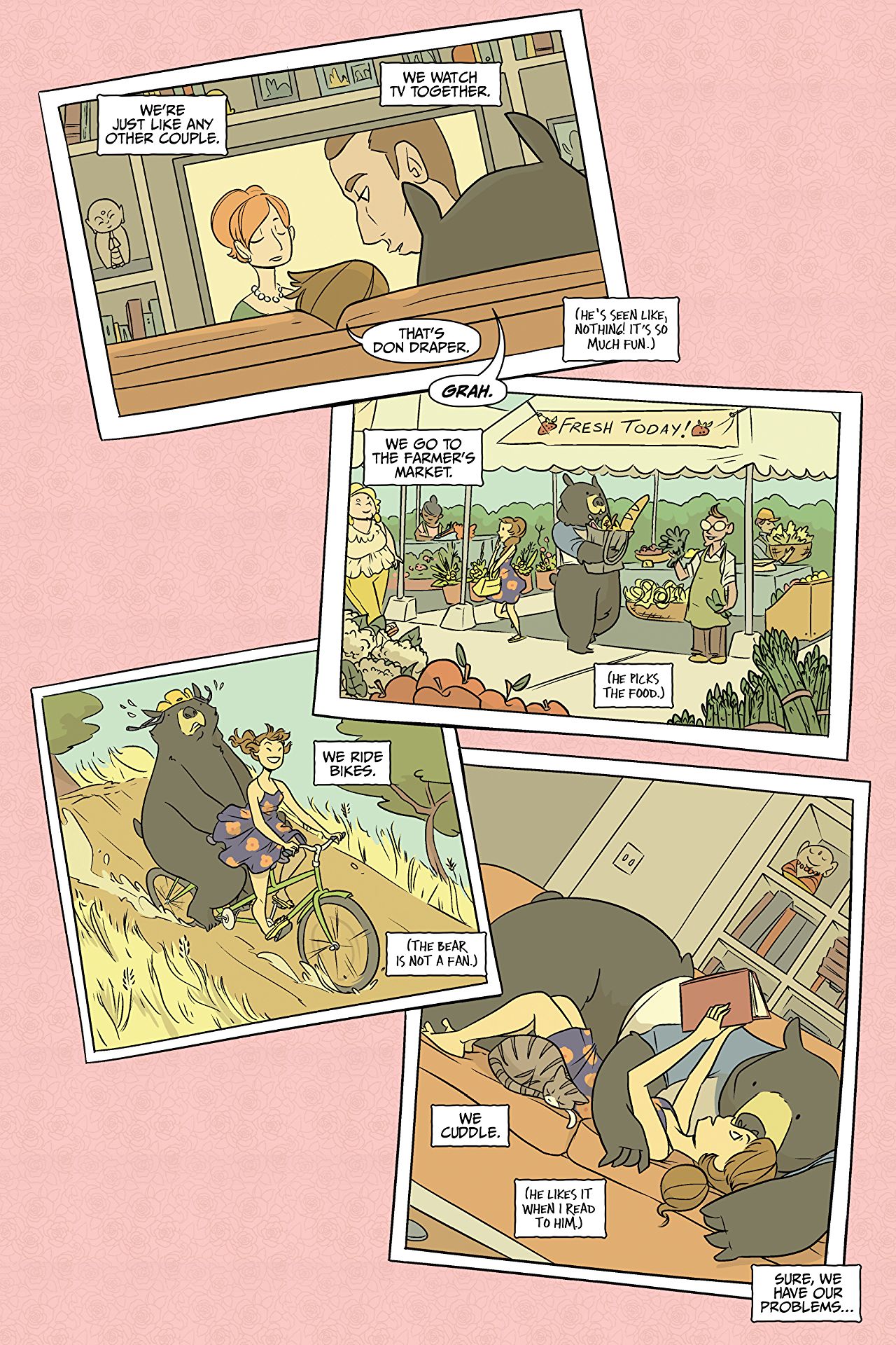 So uh… Yeah. This is a really cute graphic novel that I got to read with my GF, but the idea of them having sex as human and straight up regular bear was honestly strange and a little off putting. Bear cuddling is cute, straight up intercourse with an animal is weird.
