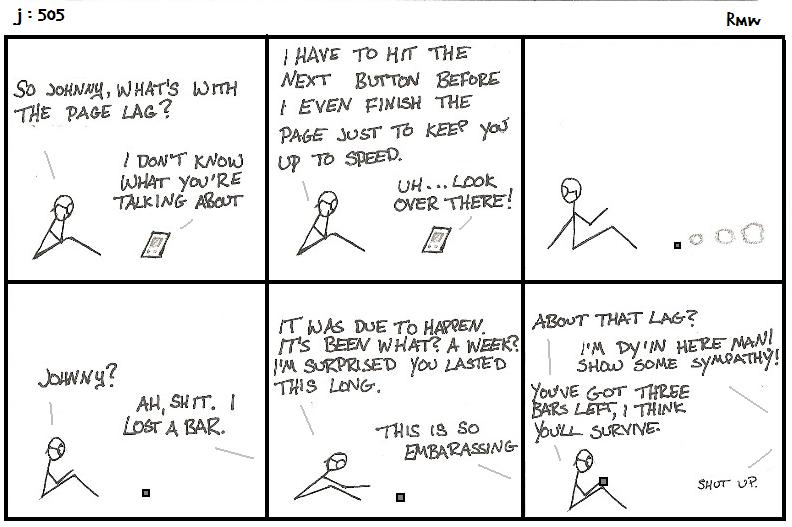 Randi has some problems with the page lag on the Sony 505. It’s an eInk thing, I think – they all do it: Kindle, Sony. ALL THE COOL KIDS are doing it, ALRIGHT?!!