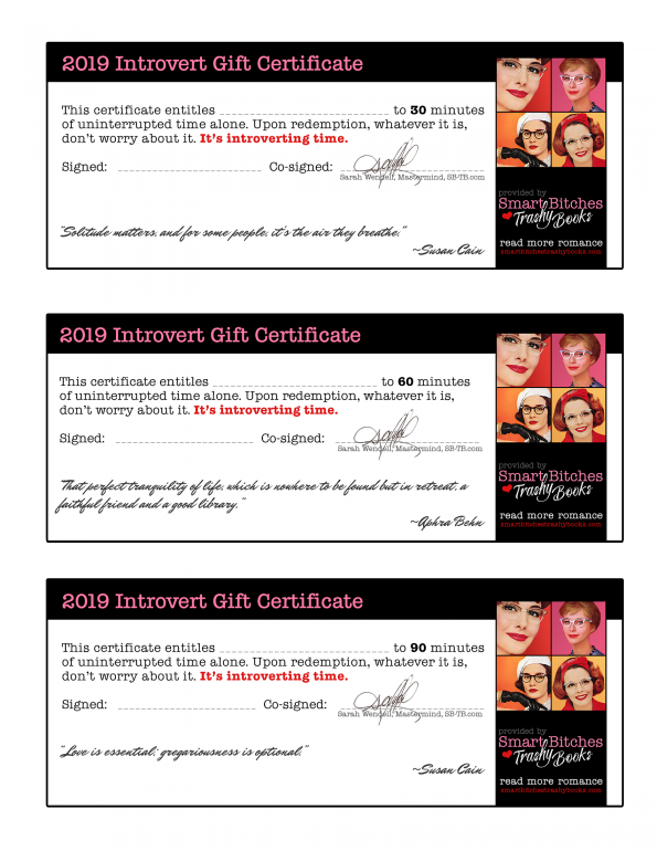 […] From Smart Bitches – charitable gifts and reading certificates. Randomly delightful. […]